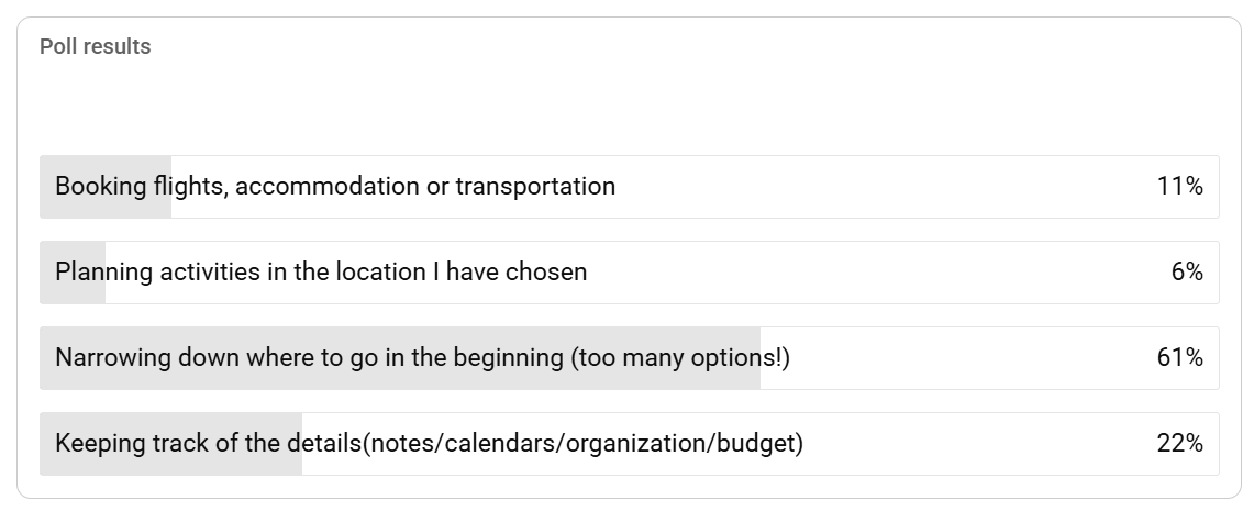 The logistics and planning aspect of travel can be overwhelming sometimes, and I am often asked what method I use to narrow down where to go when planning travel. In fact, I recently did a poll on YouTube to ask people what they found the hardest and here is what they said!